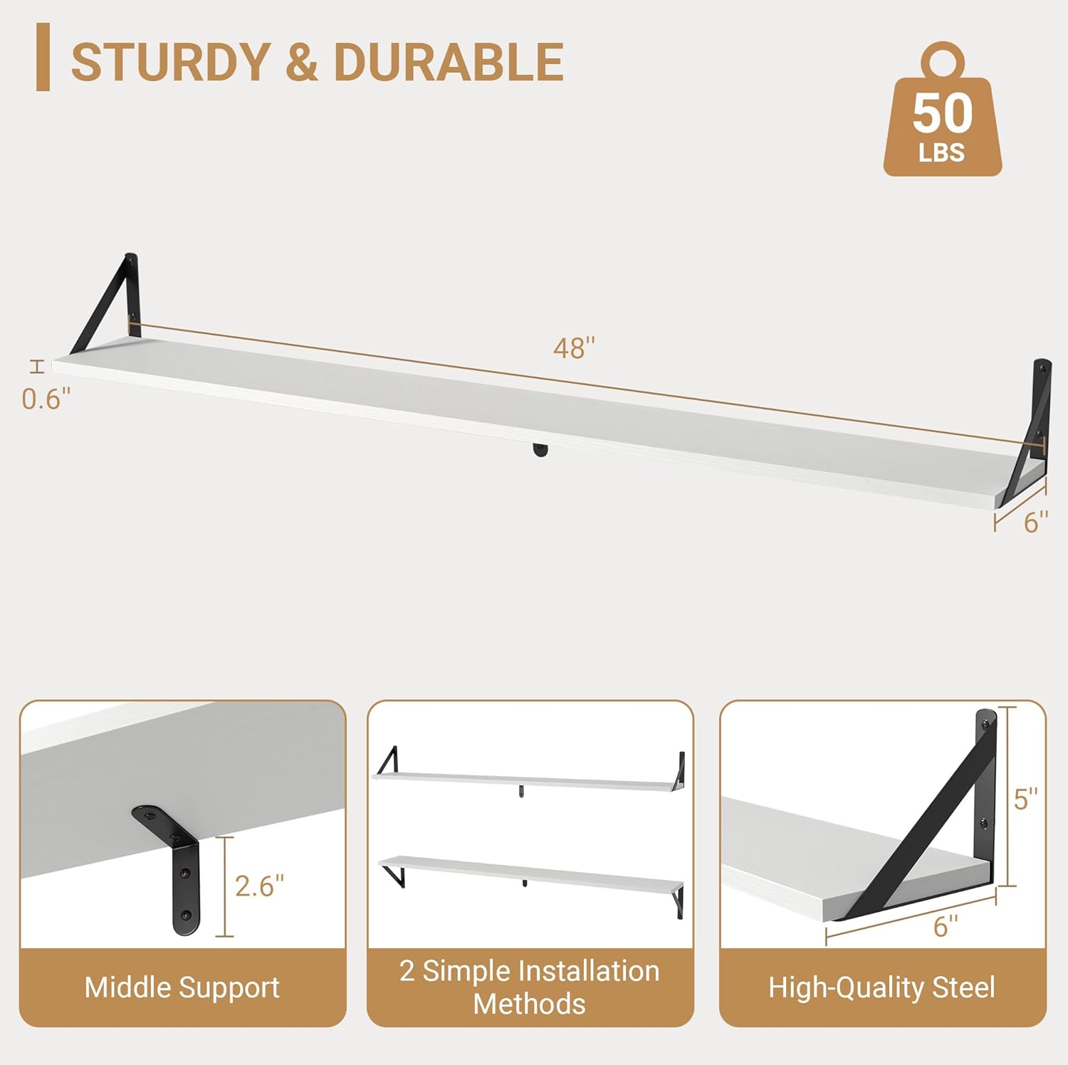 - 【STURDY & DURABLE】Each wood floating shelves is made of 0.6-inch thick natural wood planks and powder coated steel brackets for durability. The triangular metal brackets are even stronger and can hold up to 40 pounds