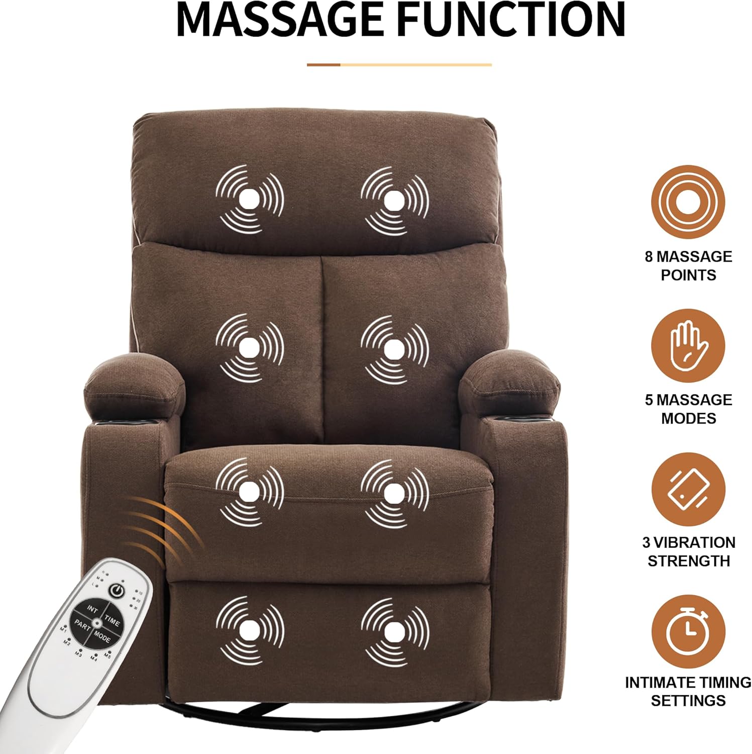 Swivel Power Recliner Chair for Adults with Full Body Massage, Electric Rocker Recliner Chairs for Living Room with USB and Type-C Ports, Fabric Rocking Reclining Sofa Chair (Cocoa Brown)