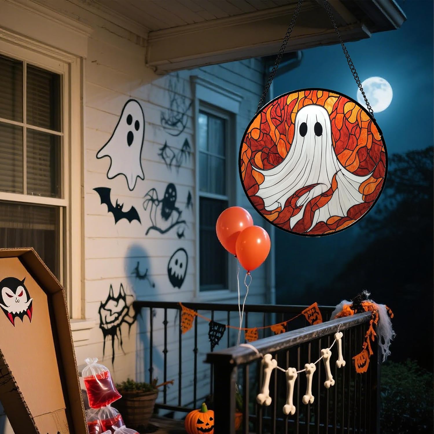 Stained Glass Window Hanging - Halloween Decorations White Ghost Orange Sky Suncatcher for Doors Garden Funny Spooky Sun Catchers Gothic Decor Horror Gifts for Women Men Friend Boy 15 in