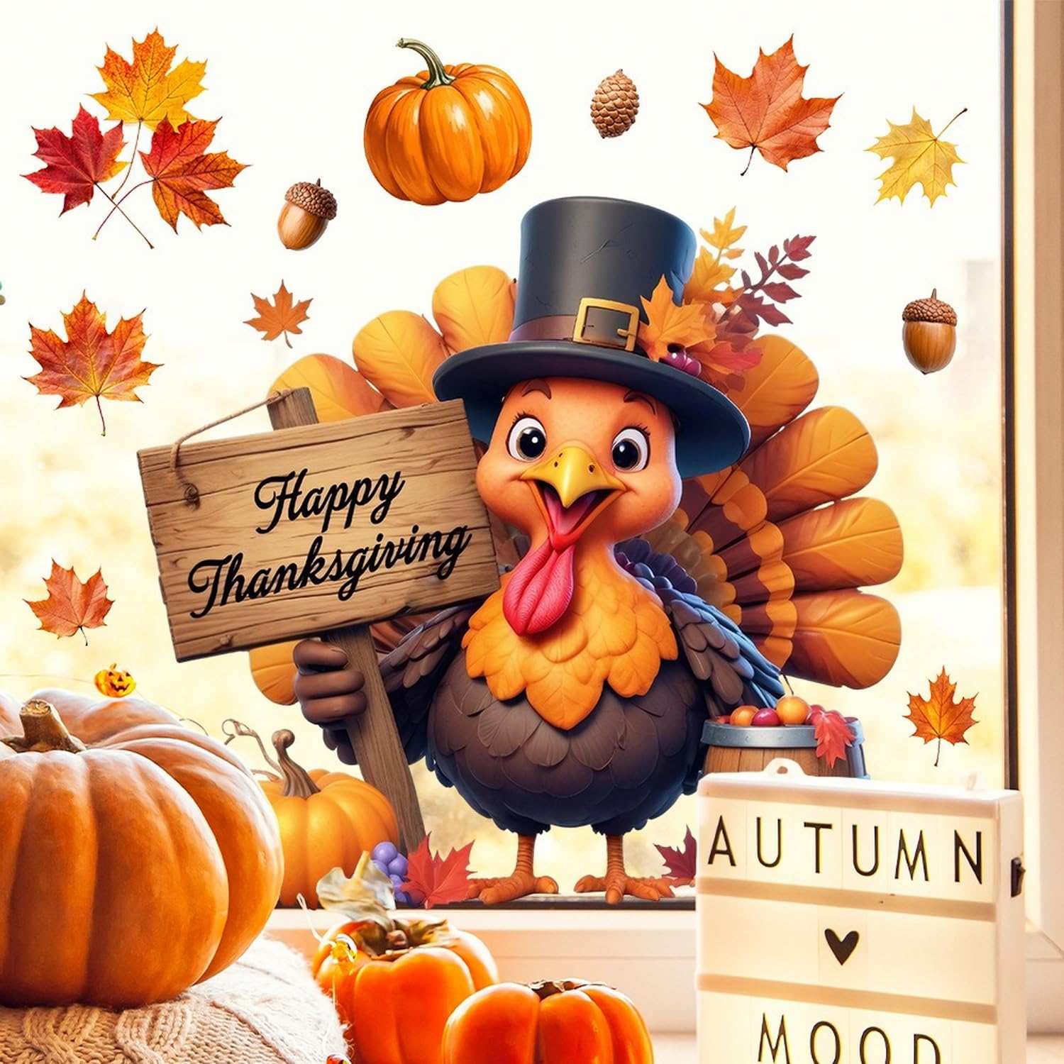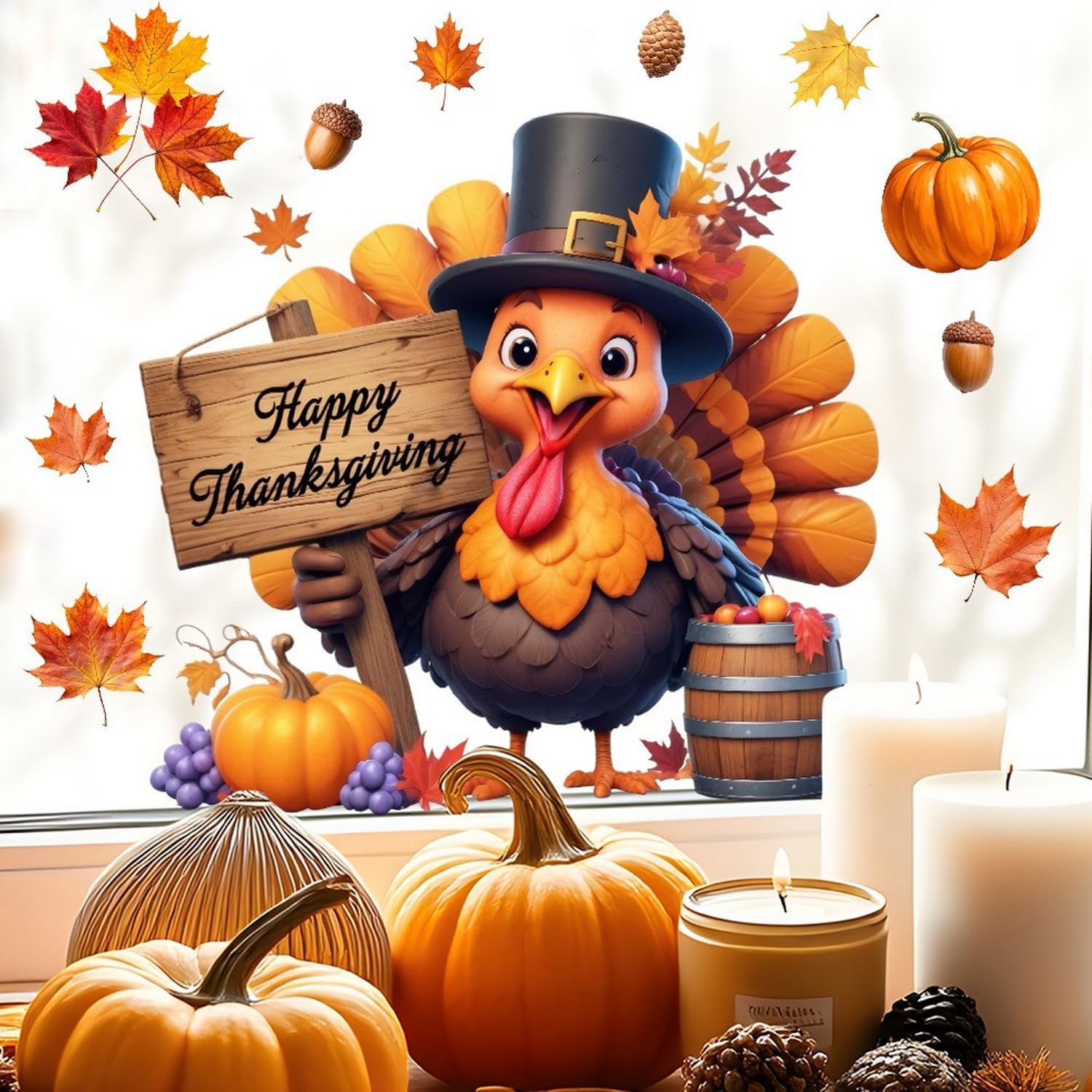 Fall Window Clings for Glass Thanksgiving Static Cling Window Decals 1PCS Turkey Pumpkin Maple Leaves Autumn Reusable Window Stickers Home School Office Decorations