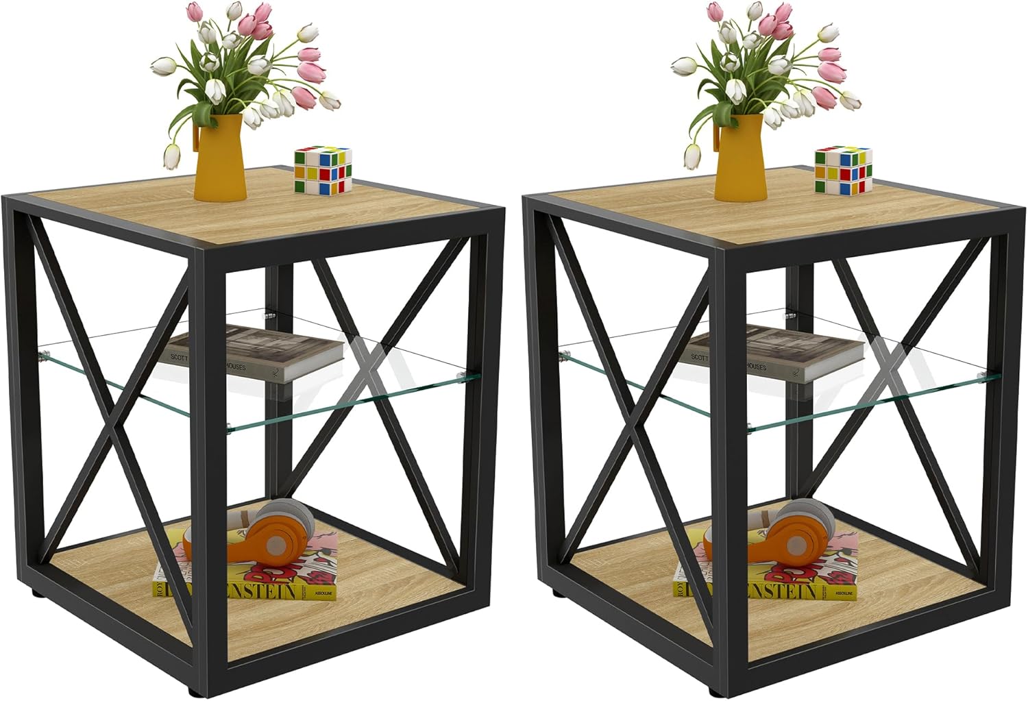 Farmhouse End Table Set of 2, Modern Side Table with 3-Tier Storage Shelf, Square Rustic Nightstand, Accent Tea Table, for Bedroom Office Living Room, Brown, Natural Wood, Glass, Metal