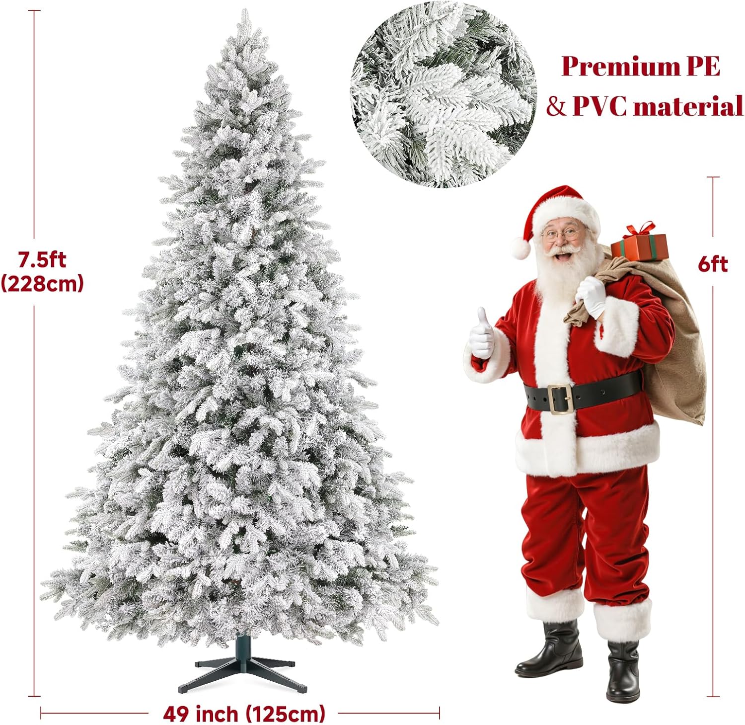 - Flocked Snowy Look: Designed with snow flocking for a realistic snowy effect, this artificial Christmas tree captures the charm of a true winter forest. Its 1470 flame-retardant PE & PVC tips create a full-bodied and lush appearance resembling an authentic evergreen. The branches are full, lush, and crafted to be odorless, fade-resistant, and safe for children and pets—perfect for years of joyful holiday decorating.