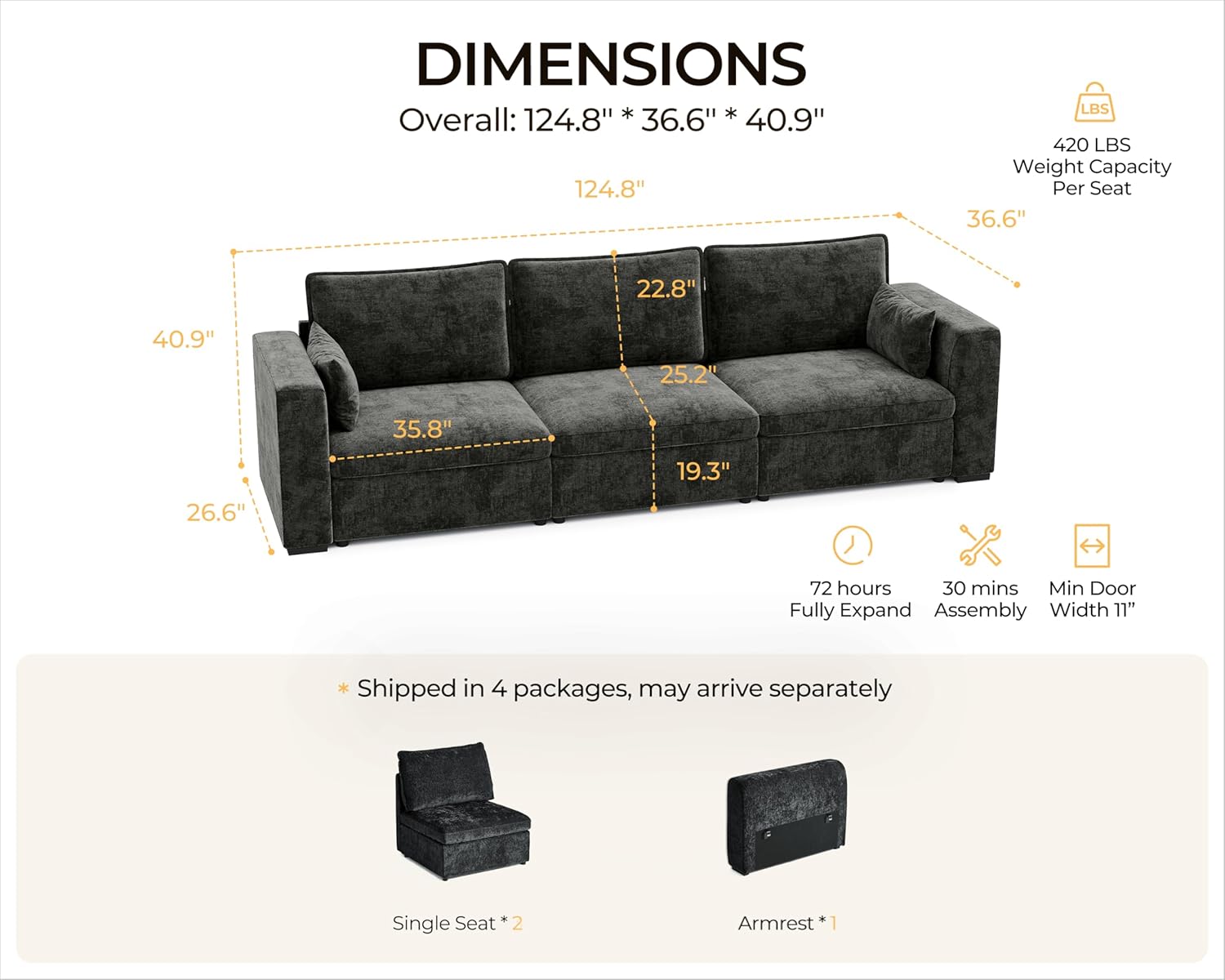 124.8'' Oversized Modular Sofa Comfy Cloud Couch with Storage, Extra Wide Sectional Sofa for Living Room, Covers Washable, 3-Seater, Chenille, Black