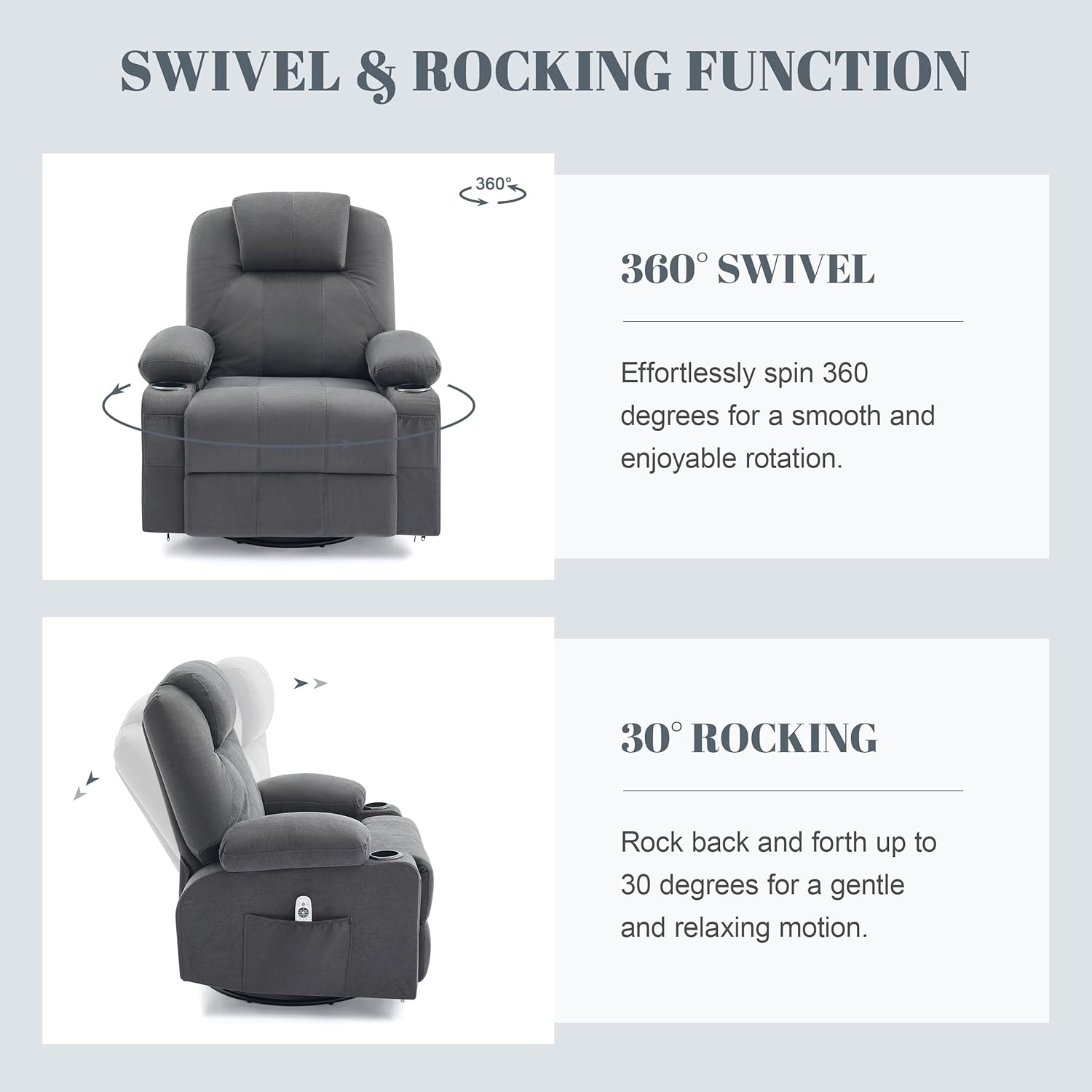- [ROCKING & RECLINING] You can extend the footrest using a side pull buckle and recline the swivel rocker recliner chairs using your body weight (up to 150 degrees). It features a 360-degree swivel function, allowing you to freely choose the direction you want to face. It also offers a 30-degree rocking function which you can rock back and forth while watching TV or reading magazines. When closing the footrest, you may encounter some resistance, so you need to close it quickly and with force.