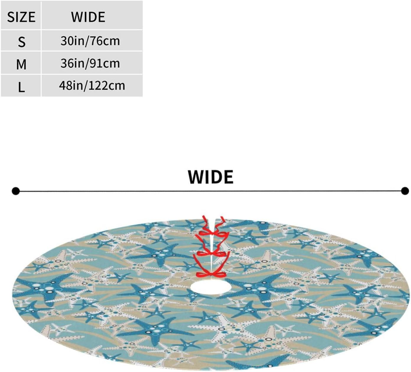 - Beach Tree skirt is measuring 36" , this tree skirt is perfect for any sized Christmas tree.Put it on the bottom of the tree, it can be a nice gift for your family and friends.In addition, the Christmas tree skirt is perfect for hiding the tree frames and all the light ropes, covering up your tree stand to keep your floors clean from pine needles or tree sap and offering a place to prop presents