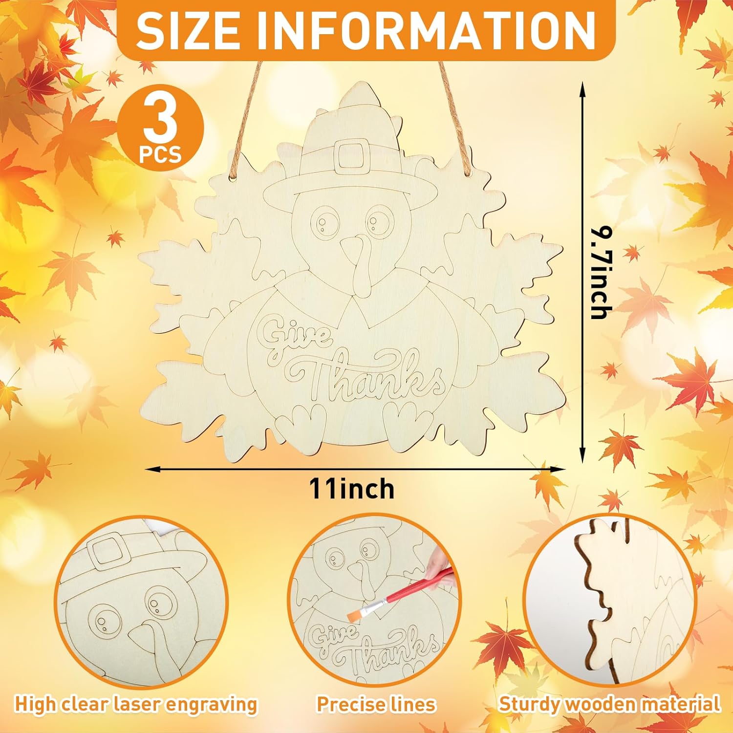 Paintable Thanksgiving Ornaments 3 Sets, Wooden Turkey Ornaments to Paint, Unfinished Give Thanks Wreaths Wood Crafts for Painting, Wood Cutouts DIY Ornament for Door Decor