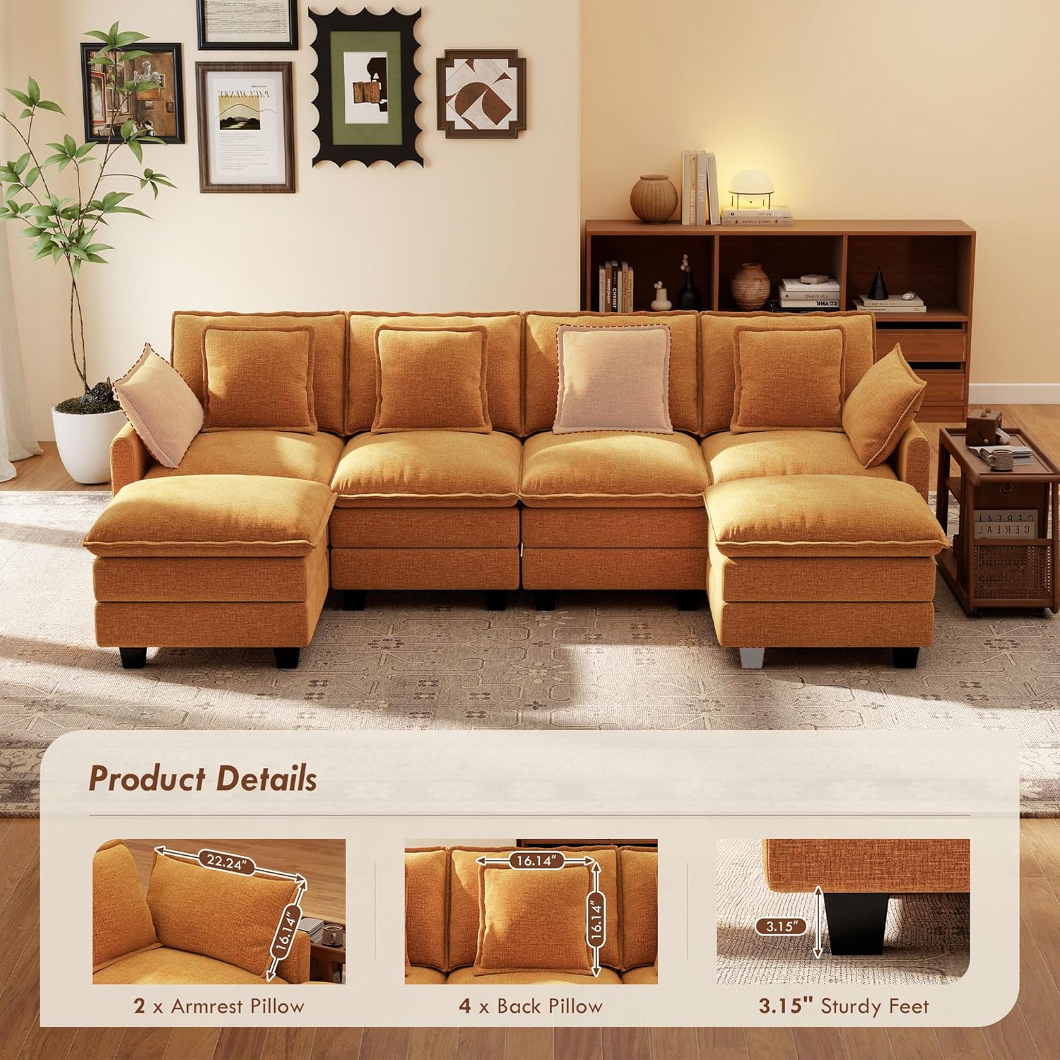 Ihanherry 106" L Shaped Modular Sectional Cloud Sofa, Modern 6 Seat Chenille Couch with Ottoman for Living Room, Bedroom and Apartment, Orange