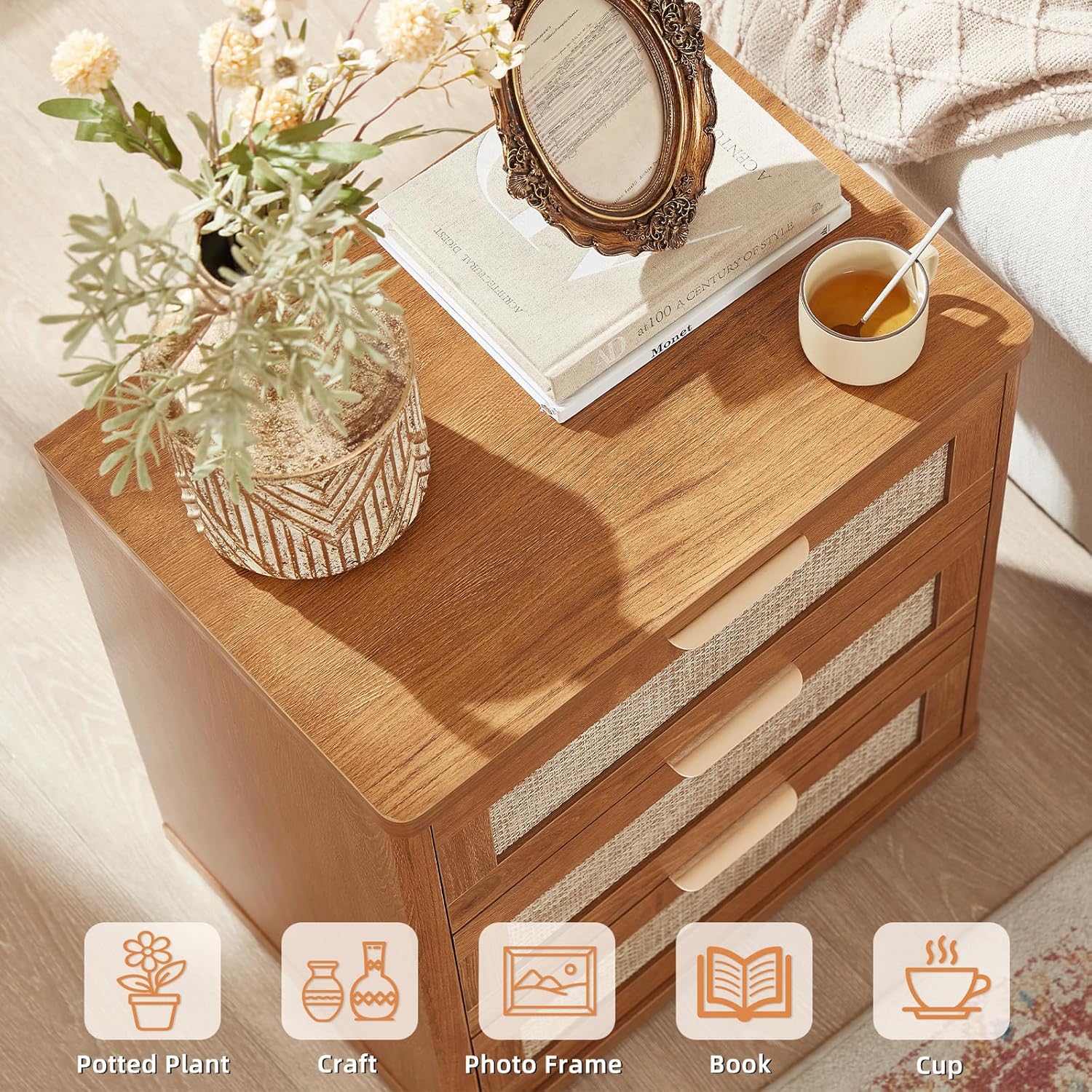 - Sturdy & Durable:This boho side table measures 23"L×15.5"W×24.2"H and is crafted from high quality wood for durability. The end table with drawers features a 1"thick tabletop,provides excellent load-bearing capacity. The 3 drawers rattan dresser with smooth metal drawer slides is easy to use and will stay with you for years to come.