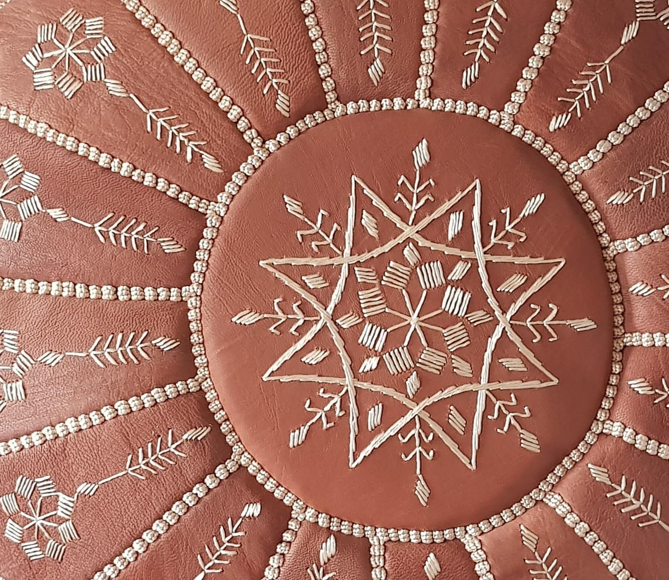 - Authentic Moroccan Leather Pouf – Handmade in Marrakesh – Crafted by skilled artisans using 100% genuine soft goat leather, this round pouf features intricate hand-stitched embroidery and traditional detailing, making each piece truly unique.