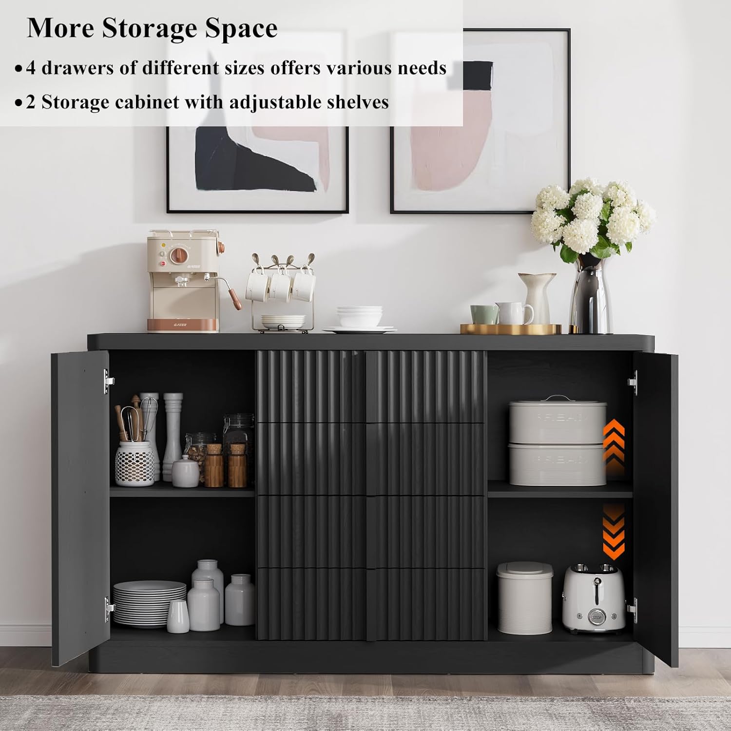 Buffet Cabinet with Storage, 60" Fluted Coffee Bar with 4 Drawers & 2 Doors, Modern Sideboard Buffet with Solid Wood Handle, Credenza Storage Cabinet for Living Room Kitchen Dining Room, Black(1PCS)