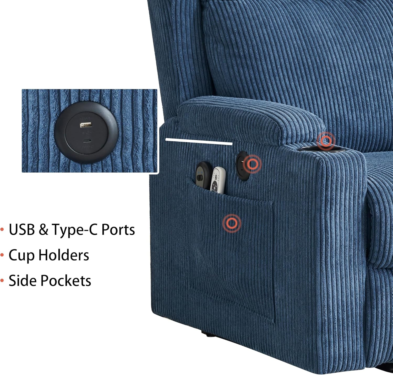 - 【Preferred Corduroy Fabric】: The recliner chair for the elderly is made of high-quality corduroy fabric, cut as a whole and precision hand-sewn. The fabric is thick and the fiber structure is tight and not easy to wear. The surface velvet strips have a unique texture and retro style, adding to the beauty of your living room or bedroom.There are also USB & Type-C charging ports on the side of the chair for your convenience.
