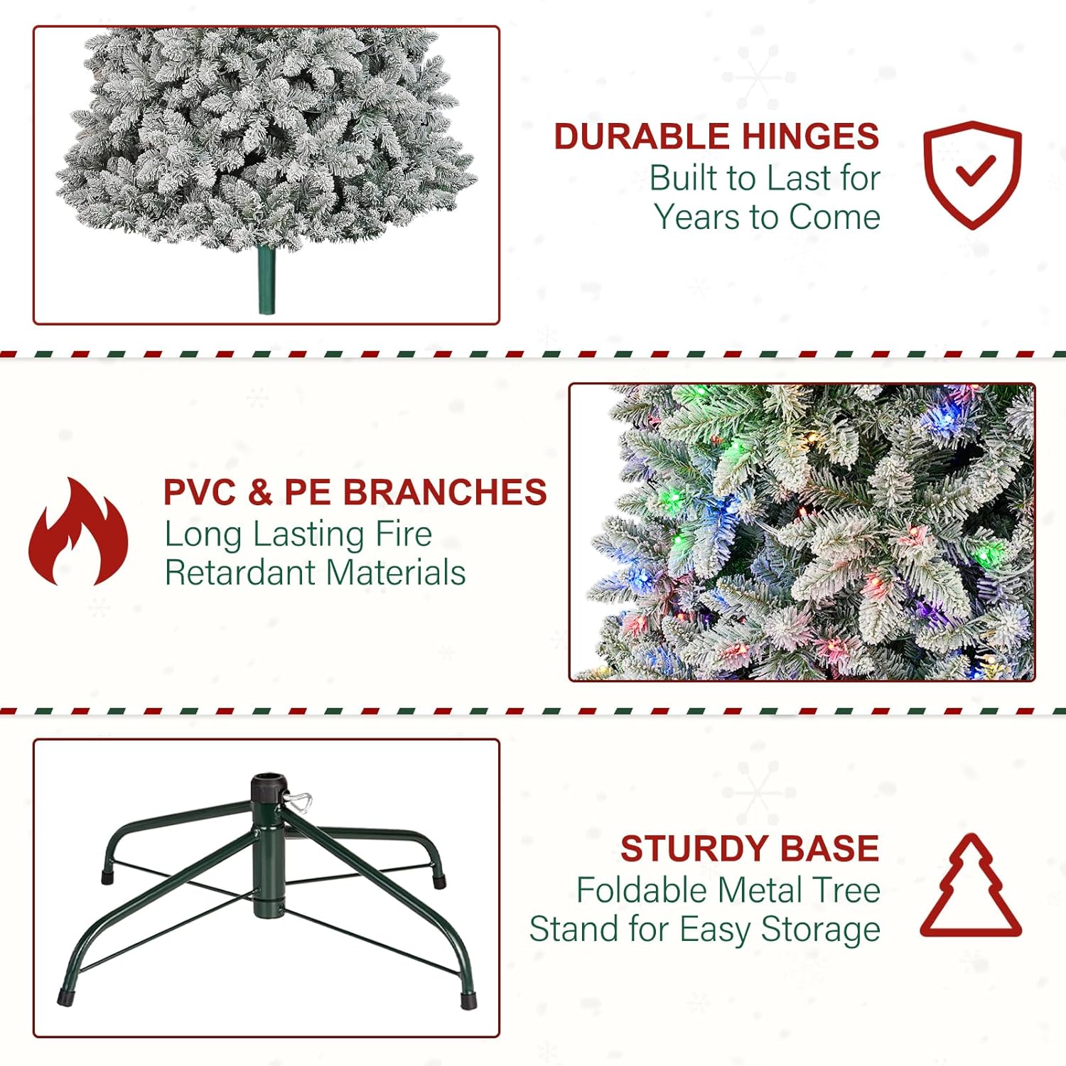 6 ft Lighted Snow Flocked Christmas Tree with Remote Control, 250 Multicolor RGB LED Lights, 1032 PVC Branch Tips, Artificial Hinged Christmas Tree with for Holiday, 15 Modes