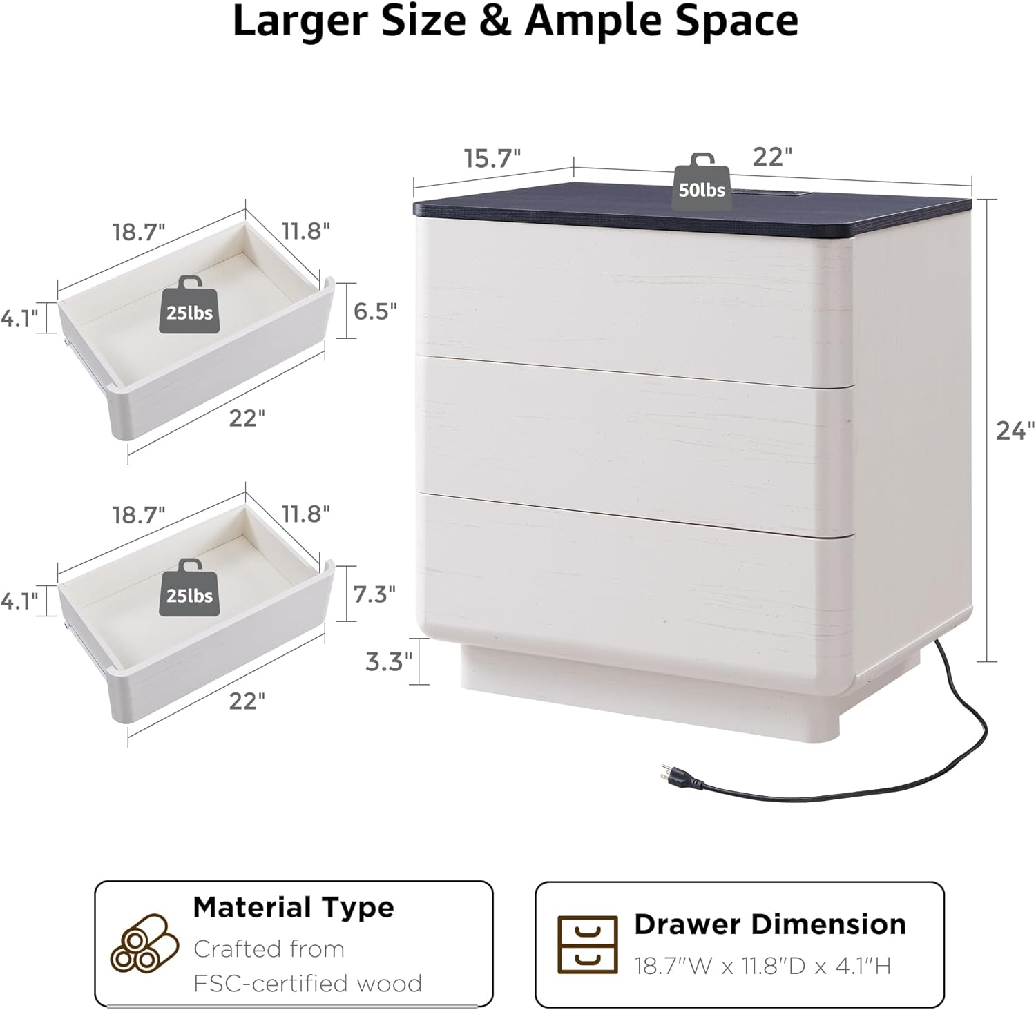 JXQTLINGMU 22" Modern Nightstand Set of 2 with Charging Station, Large Push-to-Open End Table, Wood Bedside Table, Curved Profile, Handleless 3 Drawer Night Stand for Bedroom, Living Room, Off White