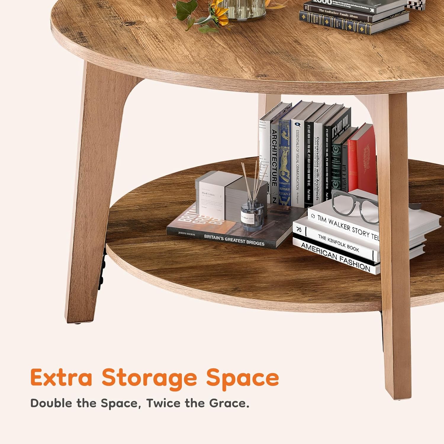 Sweetcrispy Round Coffee Table, 36'' Wood Coffee Tables for Living Room with Storage, 2-Tier Center Circle Counter with Wooded Desktop, 50 lbs Capacity, Anti-Slip Feet, Modern Farmhouse Design, Brown